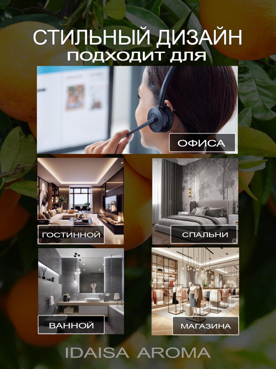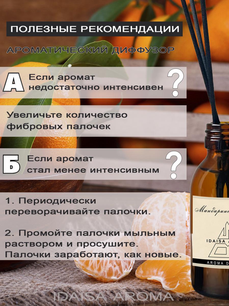 Ароматичекий диффузор 50 мл позволяет заполнить ароматом помещение не более 20 квадратных метров, для помещений большей площадью рекомендуется использовать диффузоры объемом не менее 100 мл.
